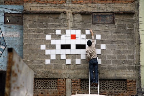 He is a French artist who imagined characters inspired by the Space Invader game made up of small coloured square tiles that form a mosaic. He does this in cities across the world. Then he documents this work as an "Invasion", with books and maps of where to find each invader.